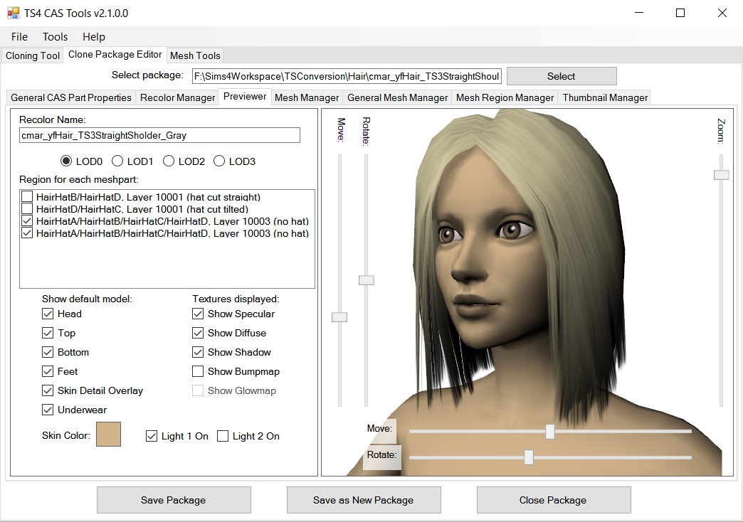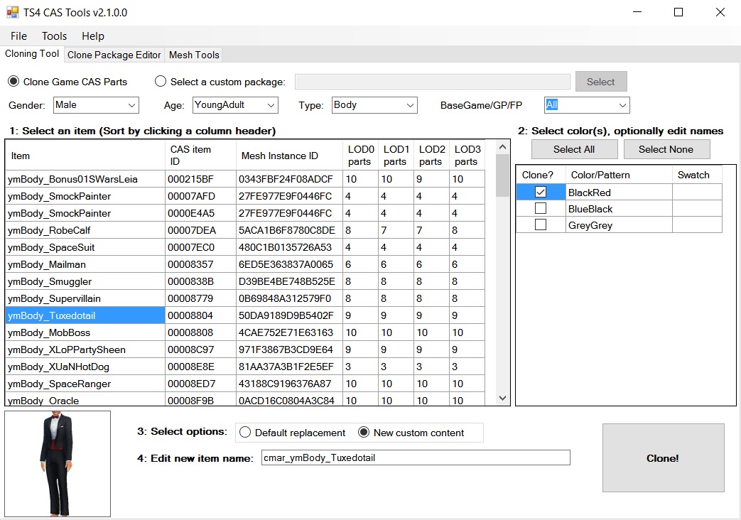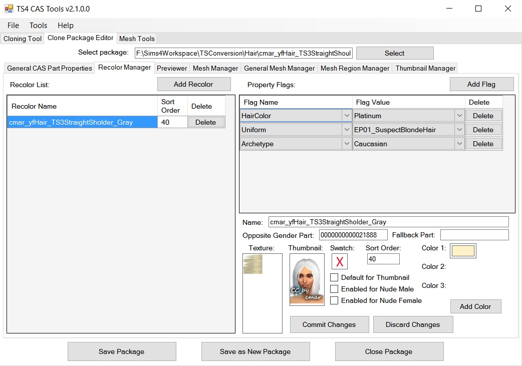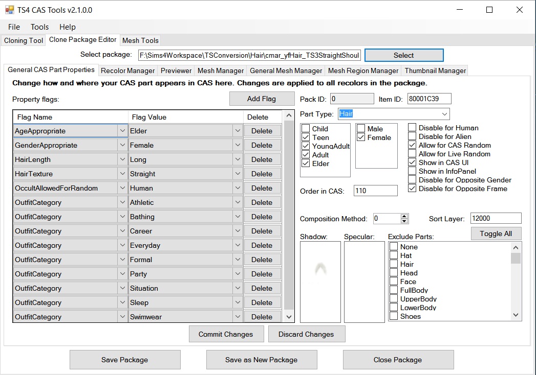 Начиная с версии 3.4, CAS Tools поддерживает совместимость с Legacy Edition. На вкладке редактора клонированных пакетов, на вкладке общих свойств частей CAS теперь есть флажок "Совместимость с Legacy". Это означает, что пакет сохраняется с предыдущей версией формата CASP. Единственное отличие заключается в том, что пакеты, совместимые с Legacy, не могут быть настроены на создание/вязание в игре, не могут использовать ползунки цвета и не могут быть связаны с HairColors. Вы также можете преобразовать пакет, который не отображается в Legacy Edition, в совместимый, открыв и сохранив его с помощью CAS Tools.