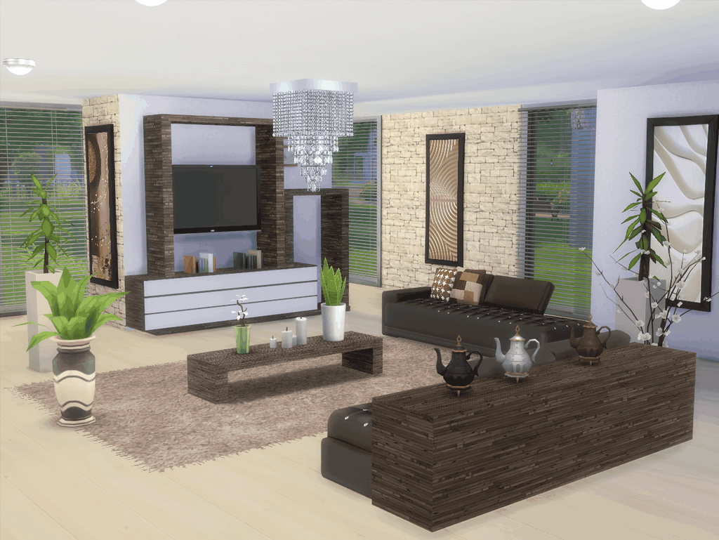 Современная гостиная с мебелью в коричневых, чёрных и белых тонах.