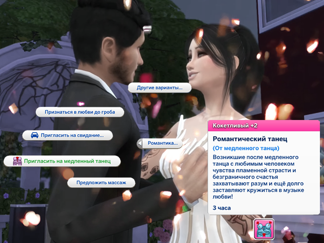 Этот мод добавляет в игру новое романтическое взаимодействие - Исполнить медленный танец. В его процессе можно поцеловать или обнять вторую половинку. После медленного танца влюбленные получают мудлет "Романтический танец".