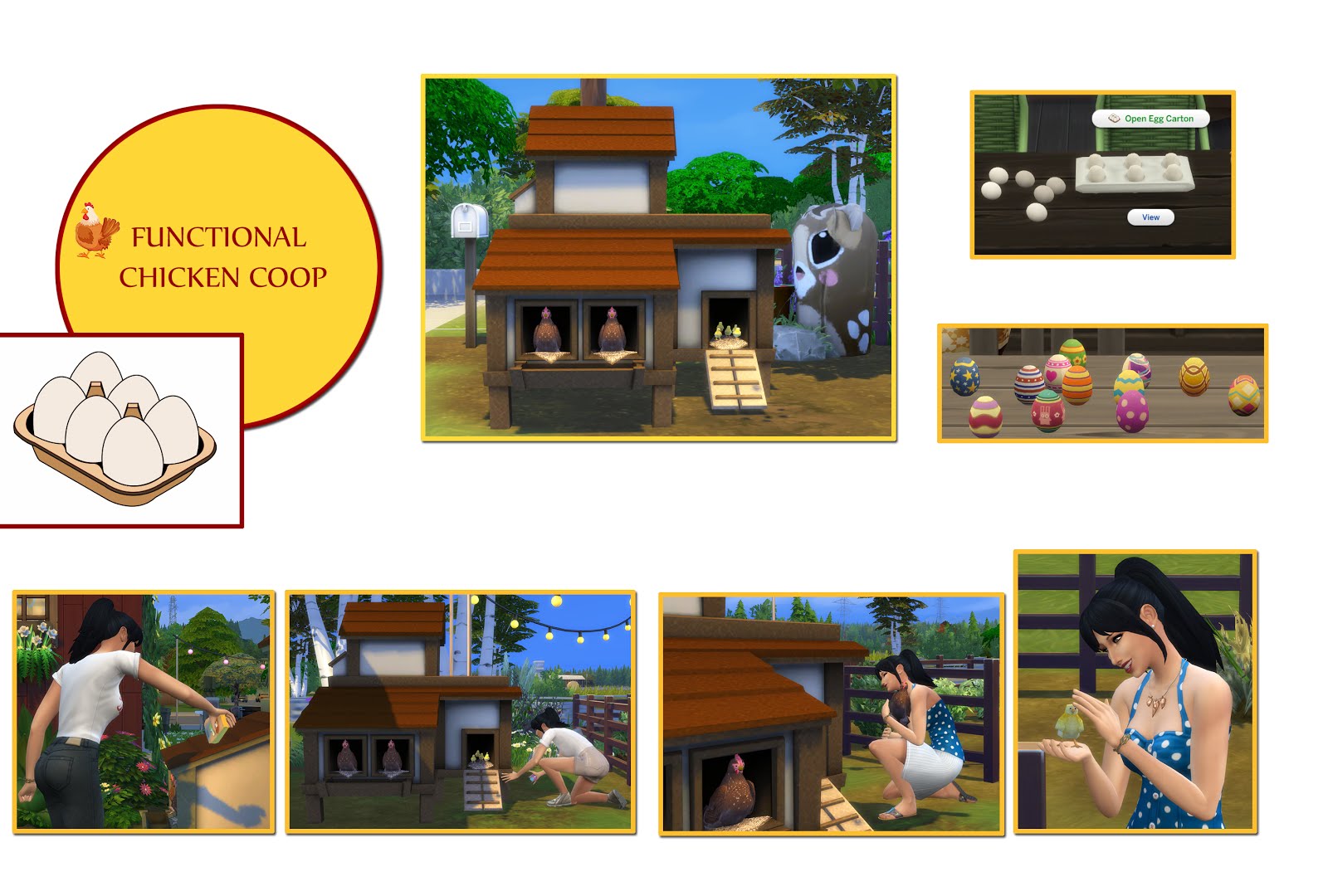 Мод добавляет полностью функциональный курятник. Можно общаться с курами, кормить их и собирать яйца. Только не перестарайтесь в обнимании куриц - можно подхватить птичий грипп или симонеллу. Анимации болезней будут доступны только при установке версии GTW.