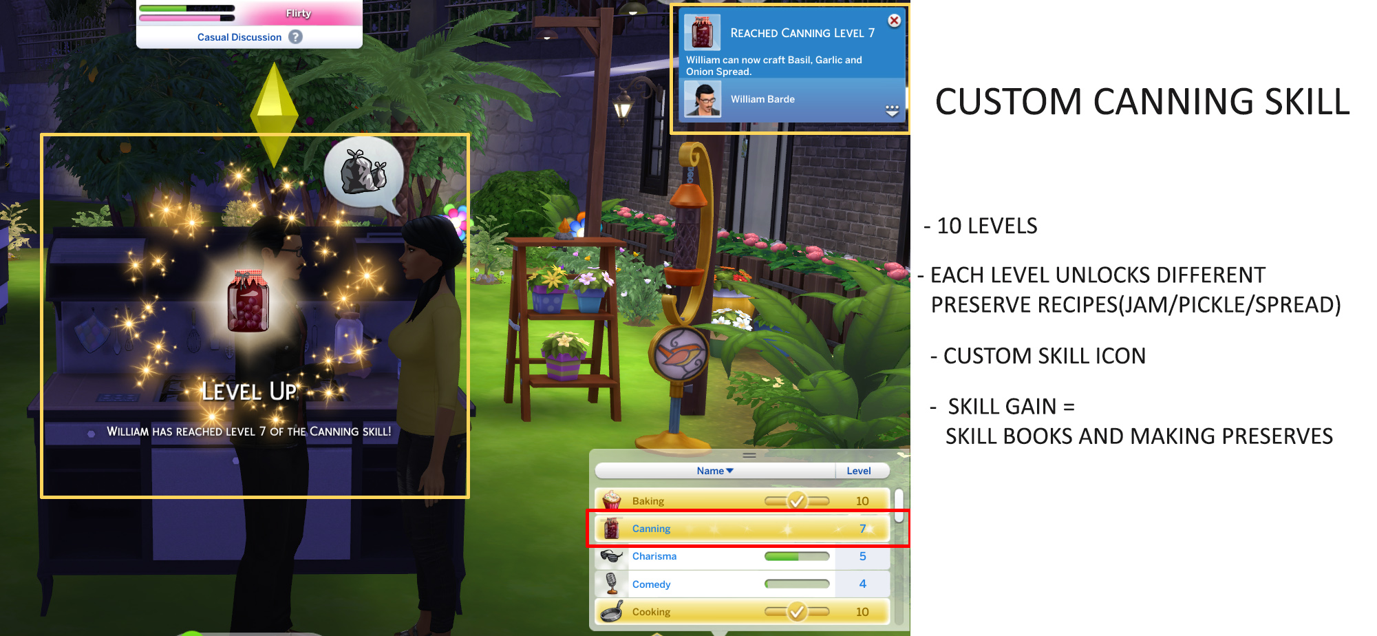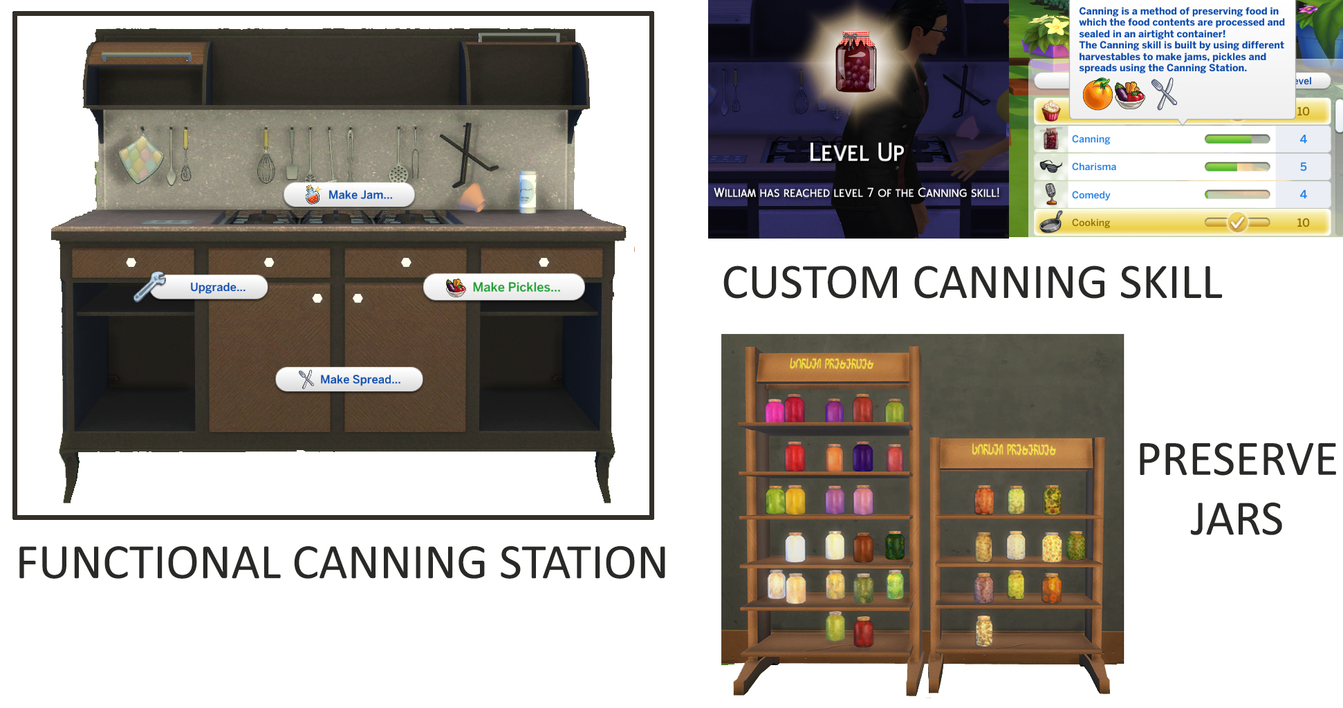 Продолжая сельскую тему, загружу еще один мод. На консервирование и соответствующий навык. Тем, кто играл в The Sims 3, функционал должен быть знаком. У навыка, как обычно, десять уровней, так же можно приобрести три книги навыков.