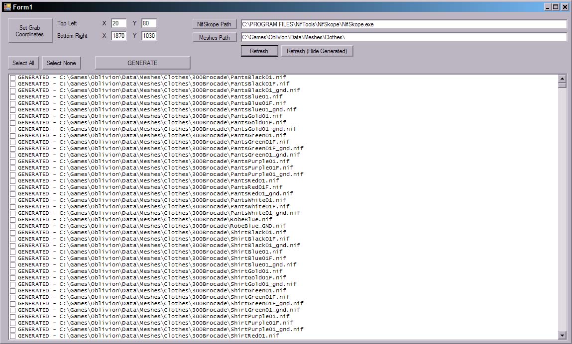 - Нажмите кнопку Refresh. Refresh (all) покажет список всех nif файлов в выбранном каталоге, Refresh (Not Generated) список файлов к которым не сгенерированы превью , Refresh (Modifer) только файлы которые имеют превью но были изменены.