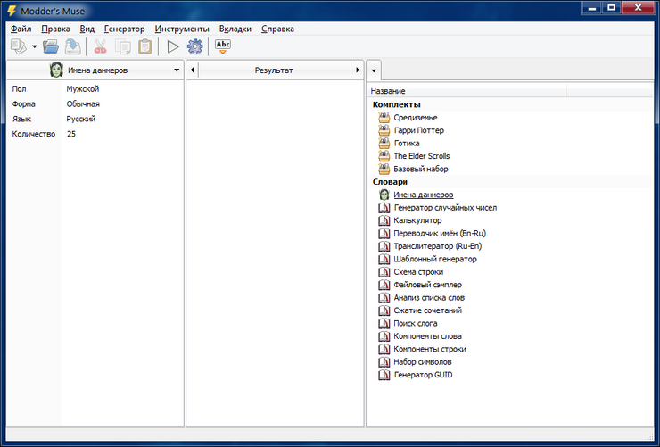 Modder's Muse - профессиональный генератор слов с функциями преобразования и анализа текста. Ориентирован на разработчиков игр, моддеров, создателей фэнфика, писателей, переводчиков, лингвистов.