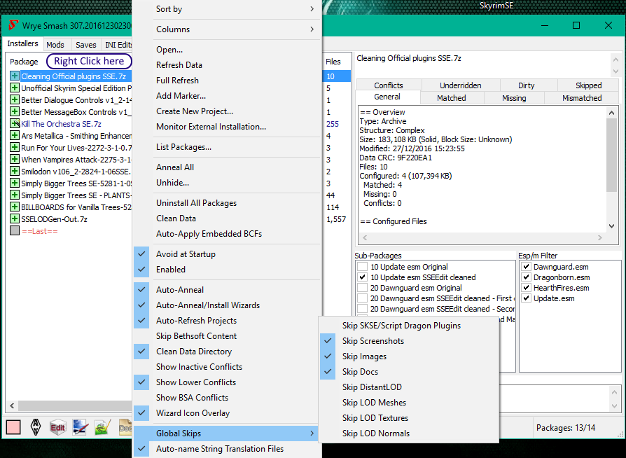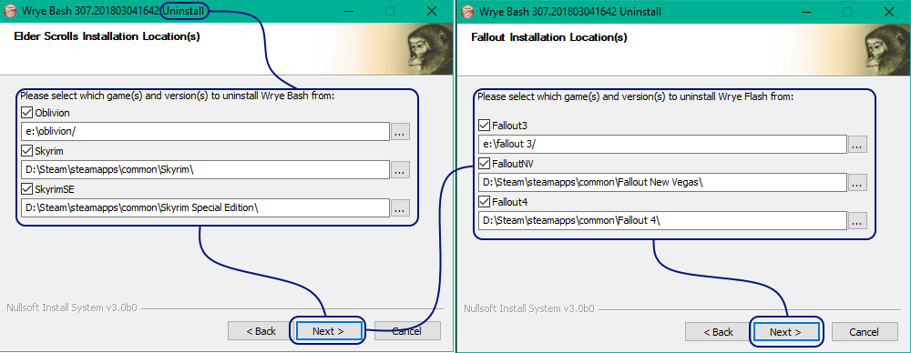 - Для второго варианта сразу откроется окно Wrye Bash, но вам придётся повторить подобную процедуру установки для каждой установки игры.