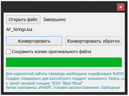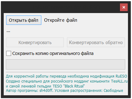 * Программа может производить обратную конвертацию текста (т.е. замена "кодировки" RuESO русскими символами). ЭТА ФУНКЦИЯ НЕСТАБИЛЬНА! Производите обратную конвертацию только на русском тексте без переменных и прочего, т.к. программа заменит некоторые символы английского алфавита (в частности, букву "a") и делайте резервную копию.