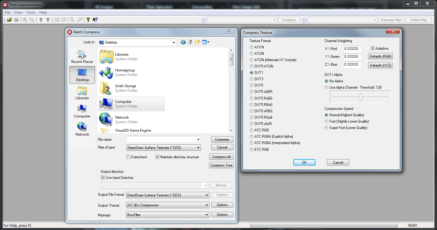 Compressonator предоставляет средства для упрощения работы со сжатыми ресурсами, позволяет наглядно оценить различия в качестве картинки до и после сжатия с использованием различных технологий и режимов. Поддерживается большой набор кодеков и форматов (ASTC, ATC, ATInN, BCn, ETCn, DXTn). Имеются инструменты для создания MIP-текстур (несколько копий текстуры с разной детализацией) и средства пакетной обработки больших баз изображений.
