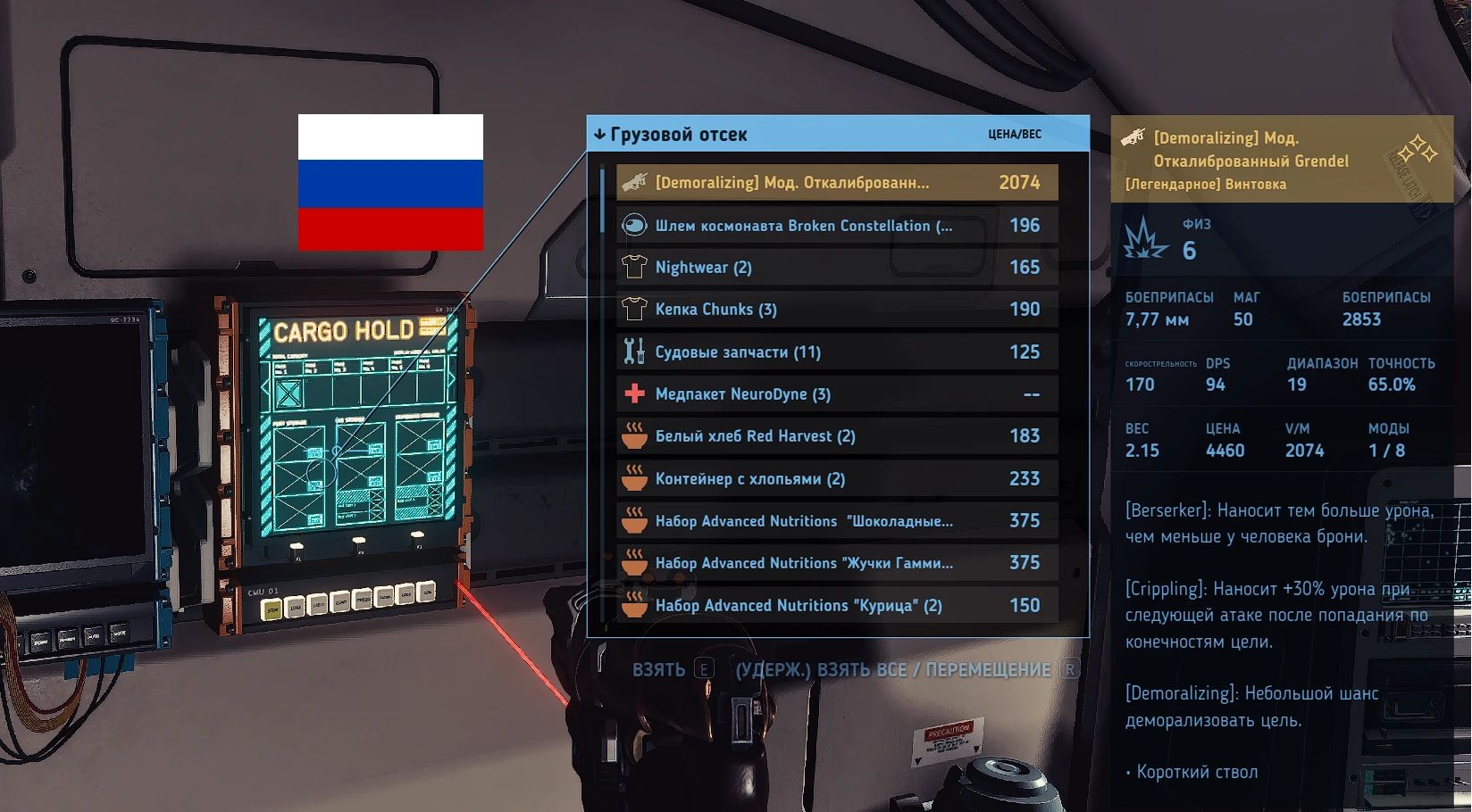 Закинуть файл StarUI_HUD_ru.txt по пути: \My Games\Starfield\Data\Interface\Translation