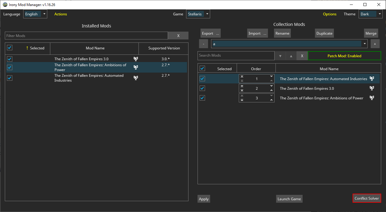 Чтобы применить моды из коллекции к игре, в Irony существует кнопка "Apply". С её помощью сохраняется заданный порядок модов в коллекции, и также транслируется в лаунчер Paradox.