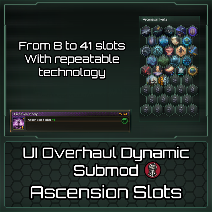 Ascension Slots же увеличивает количество слотов для перков вознесения с 8 до 41. Стандартный интерфейс Stellaris способен отображать только 18 слотов, из-за чего использовать аддон в отрыве от UI Overhaul Dynamic опасно, ибо высок шанс словить баг.
