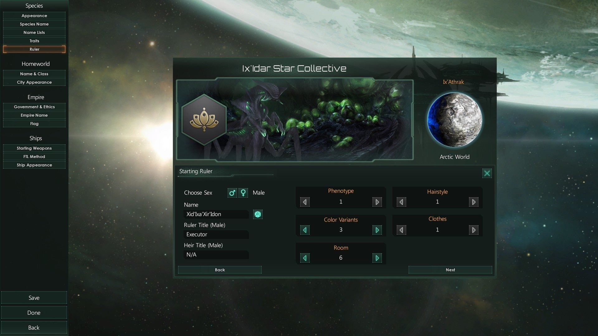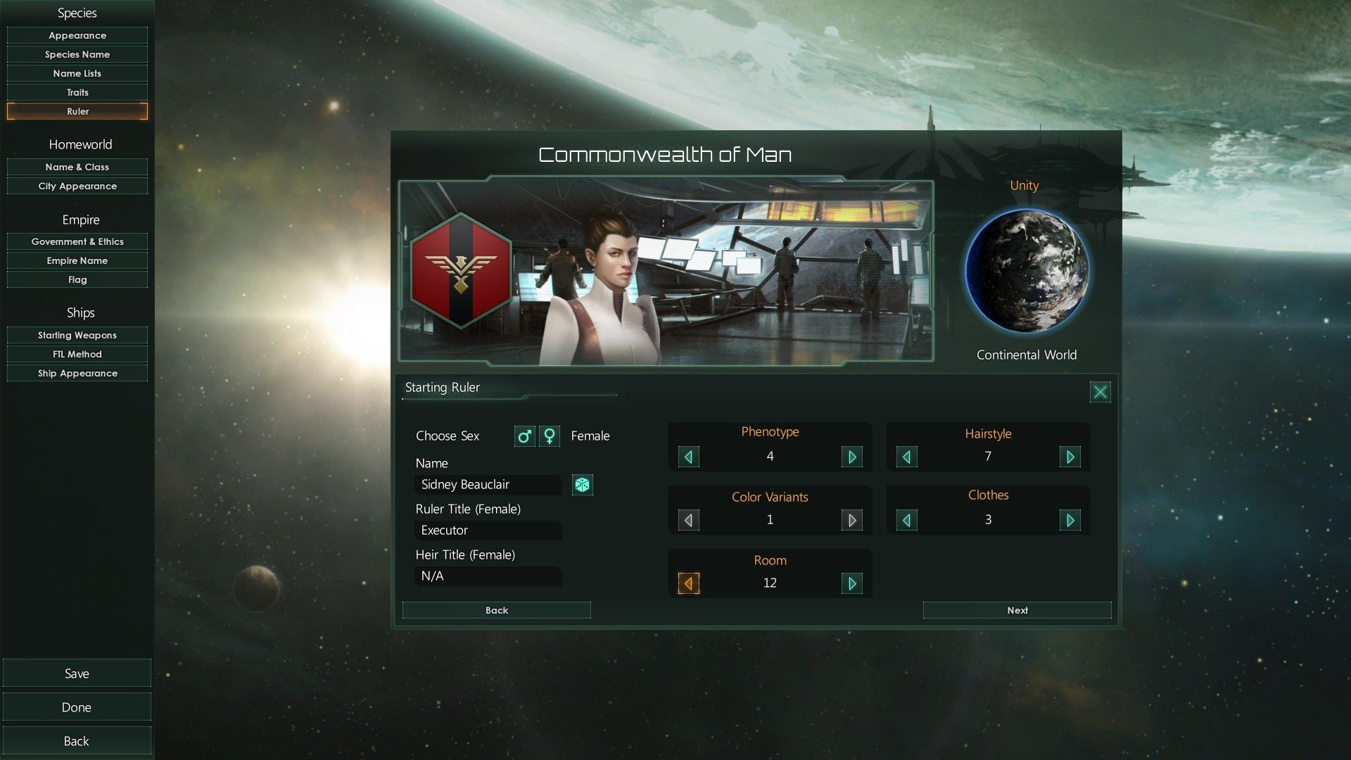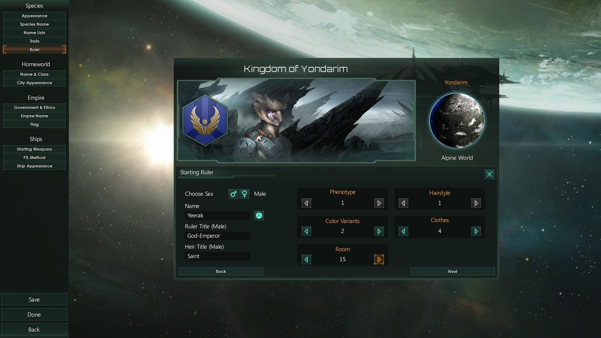 Мод добавляет в игру более 300 новых фоновых комнат, которые вы выбираете при настройке расы. Также мод разблокирует некоторые скрытые комнаты, которыми пользуются Угасшие. ИИ империи также будут использовать новые комнаты.