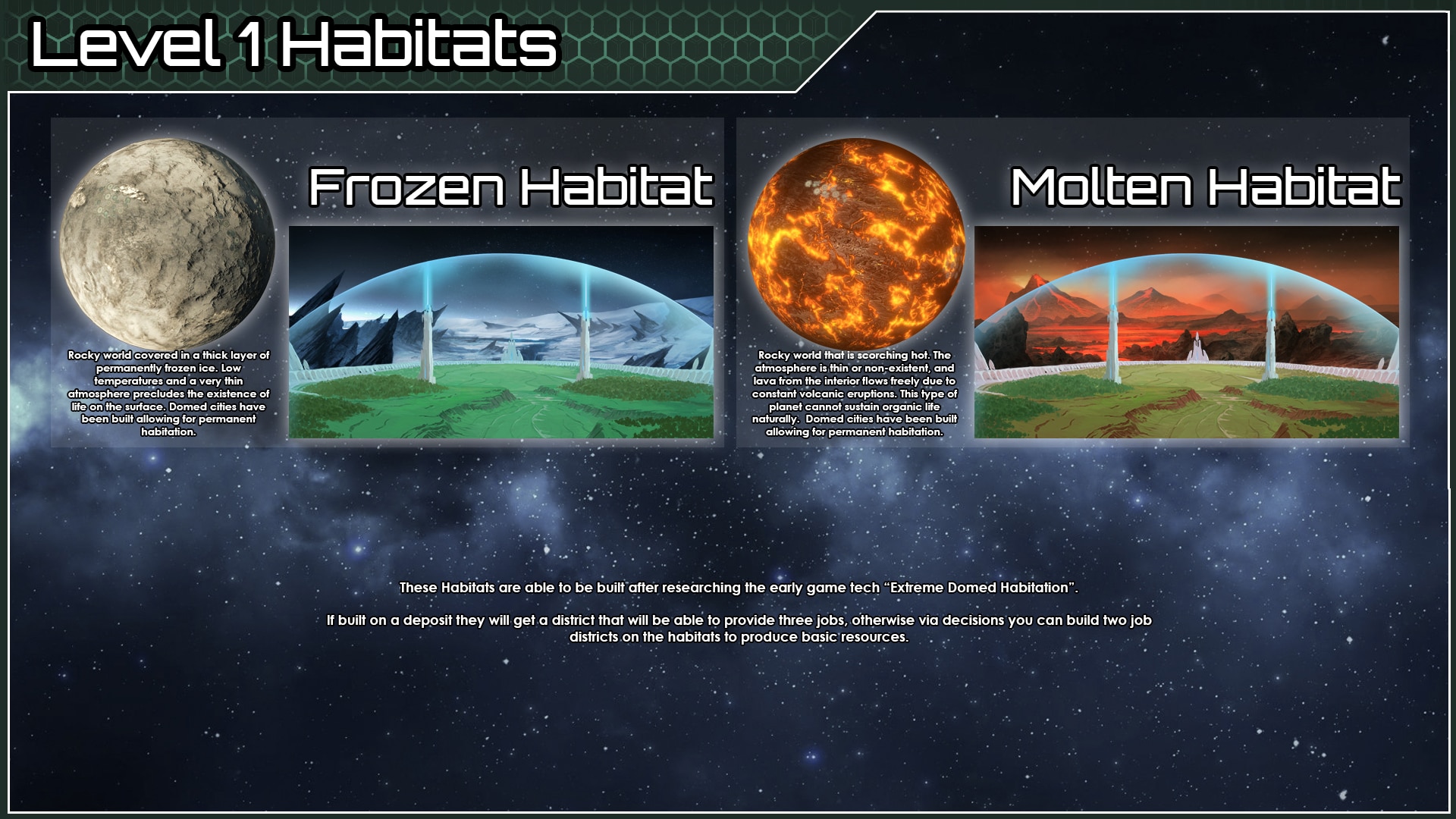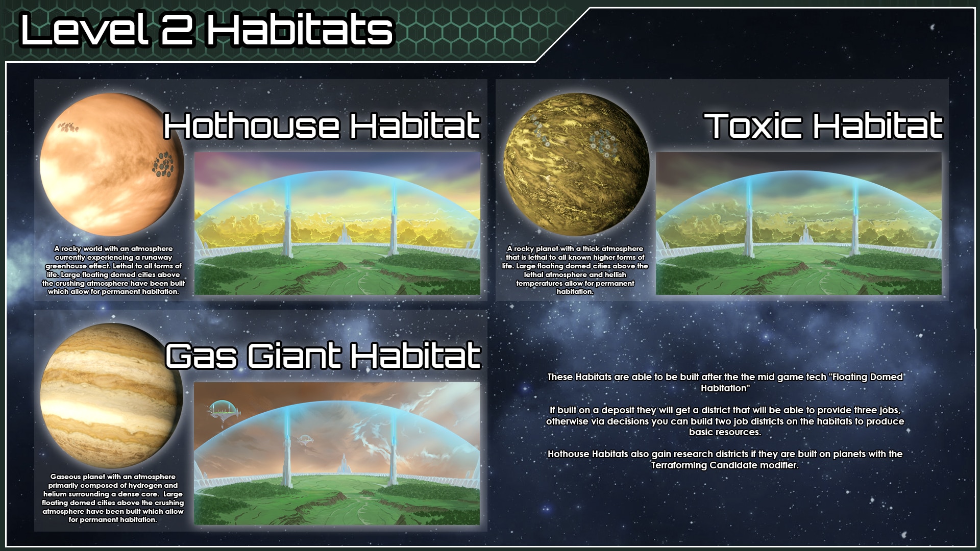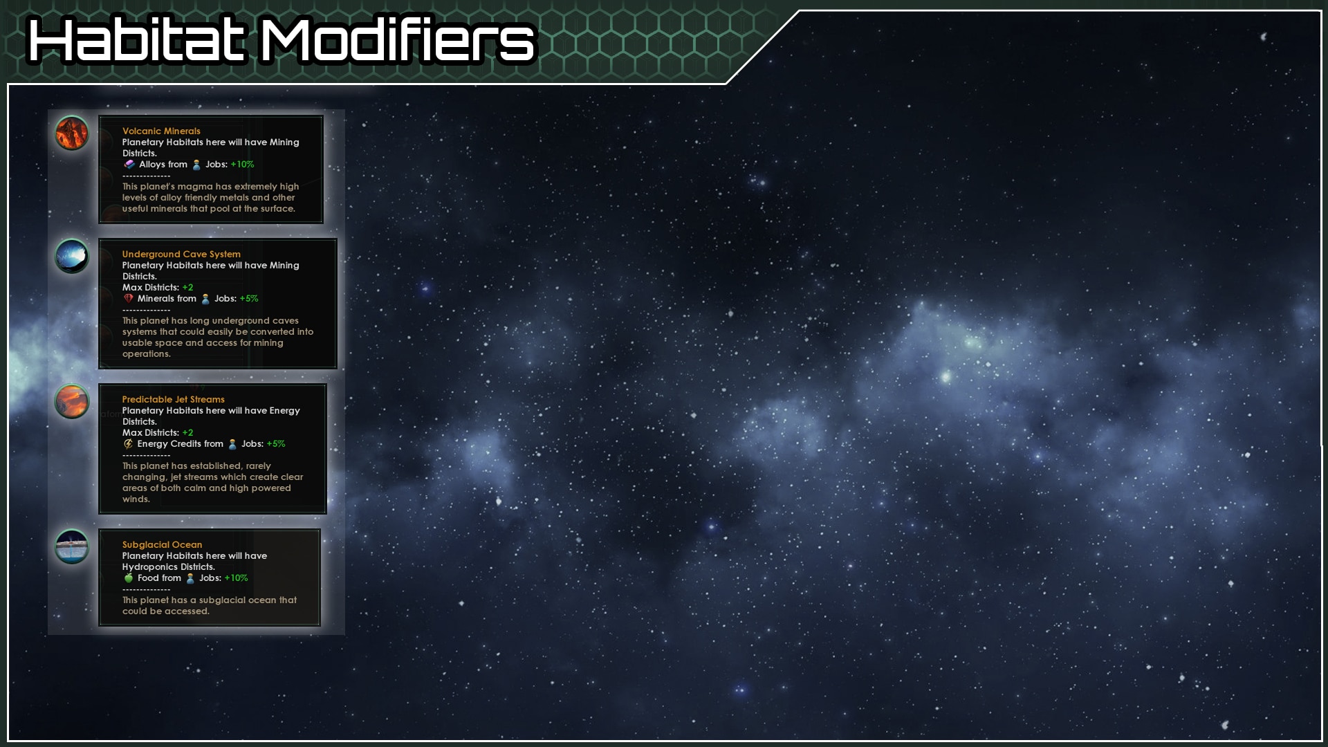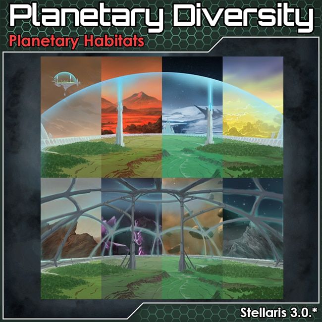 Planetary Diversity: Planetary Habitats добавляет в игру новые планетарные среды обитания. Они могут быть построены на любой планете, размер которой меньше 25 клеток. Если у планеты есть специальные модификаторы или особые планетарные свойства, то планетарные среды обитания получат особые районы с мощными модификаторами.