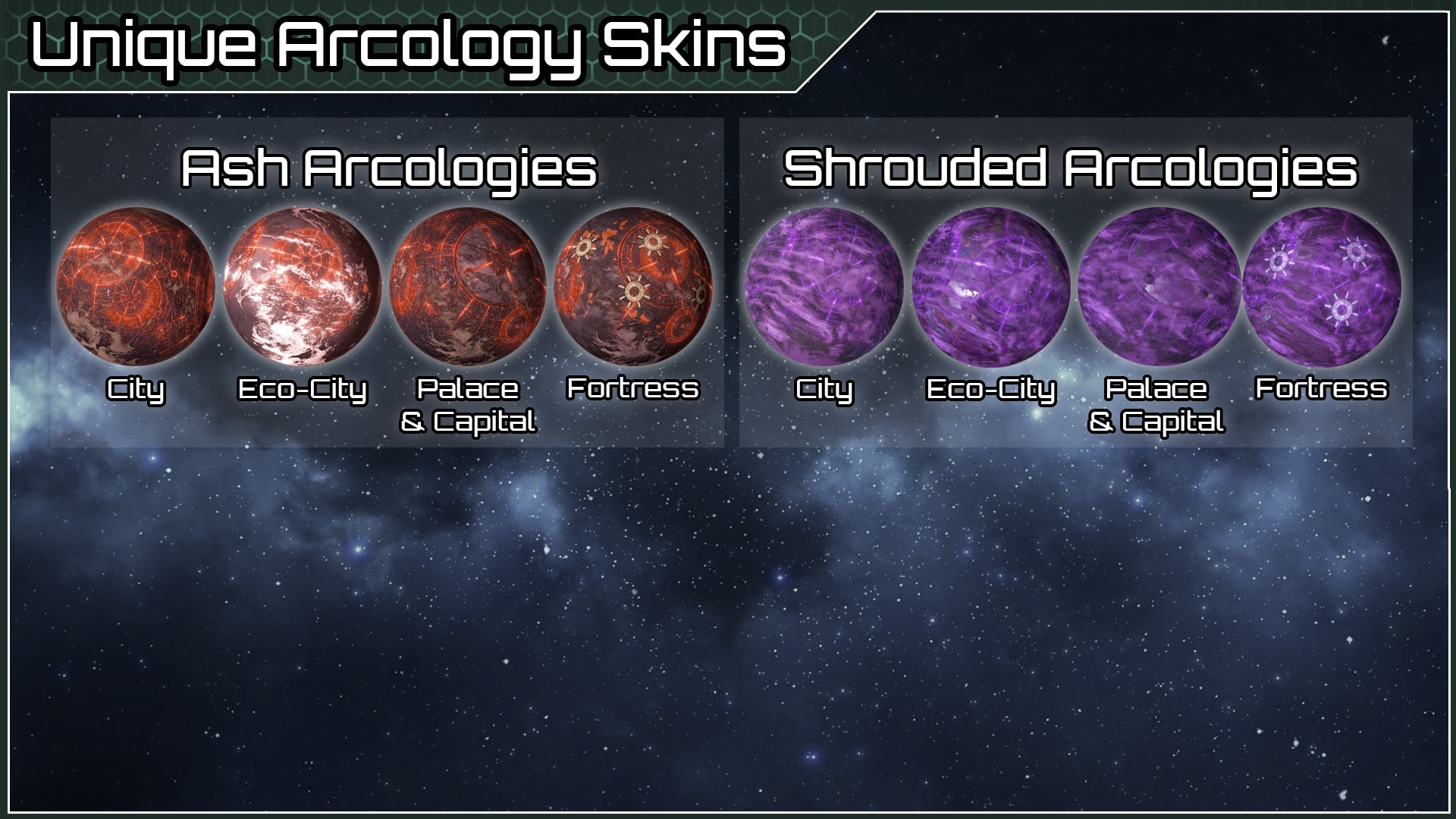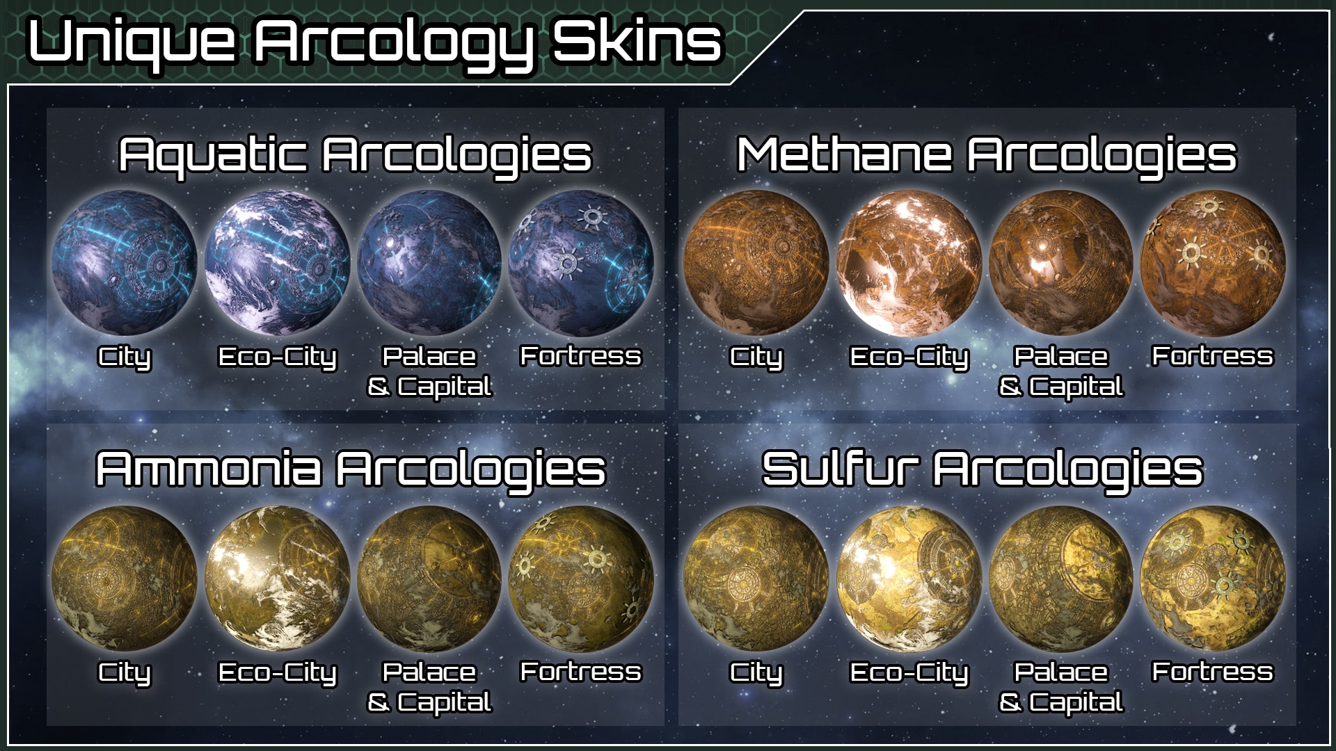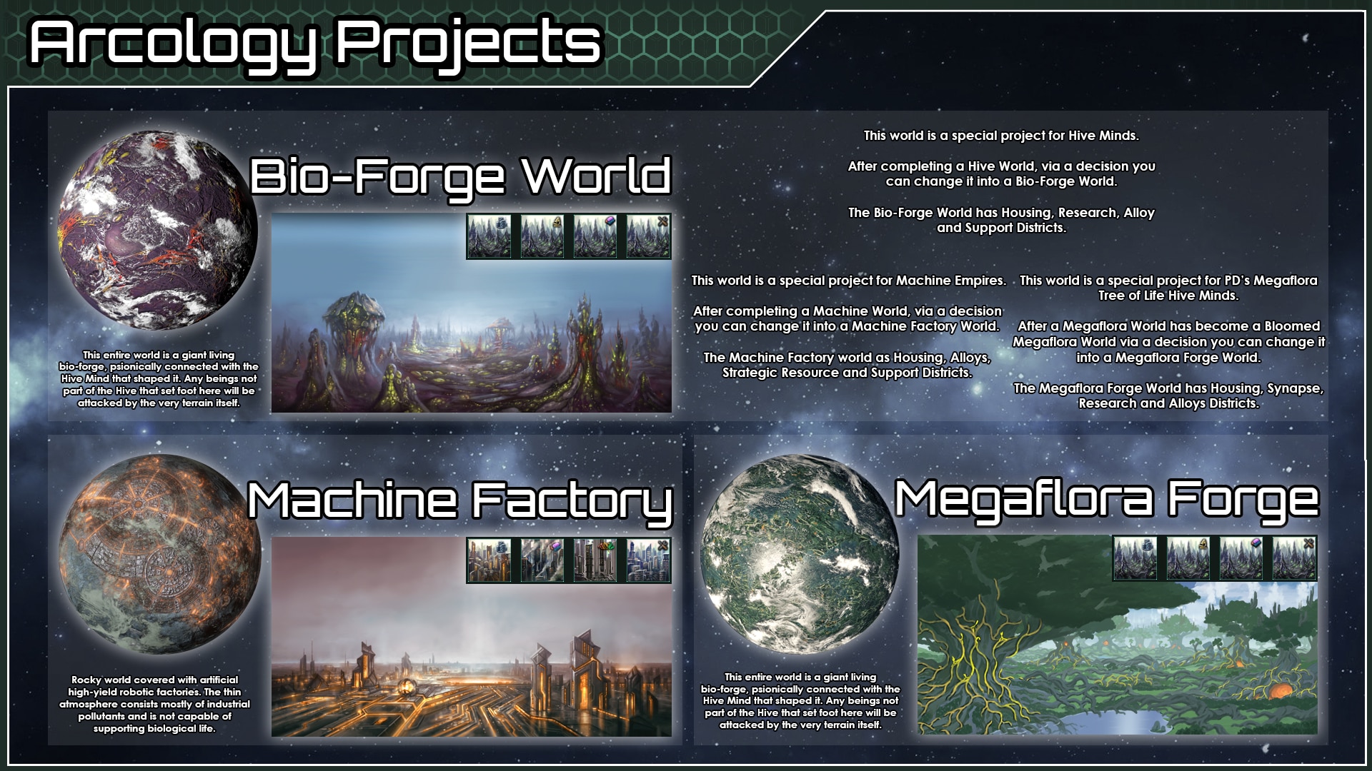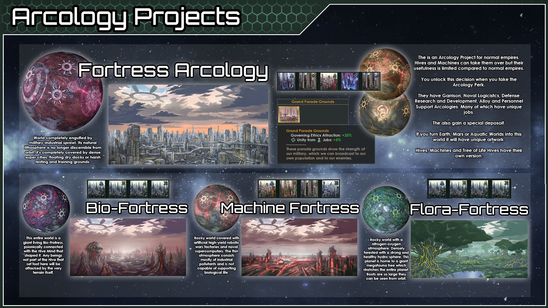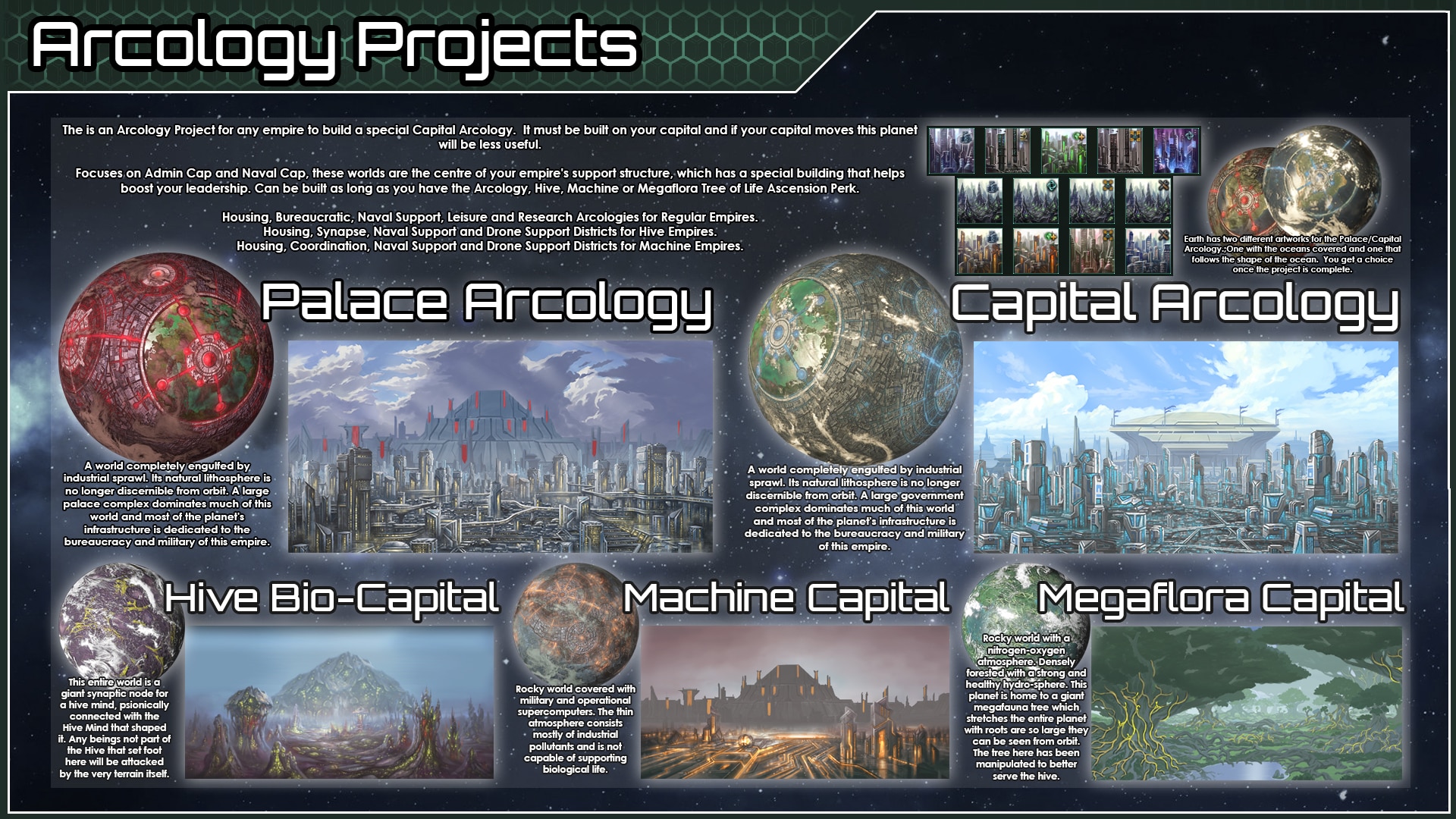 - Эко-аркология. Утопическая аркология, сфокусированная на бюрократии, исследованиях, торговле и культуре (для обычных империй).