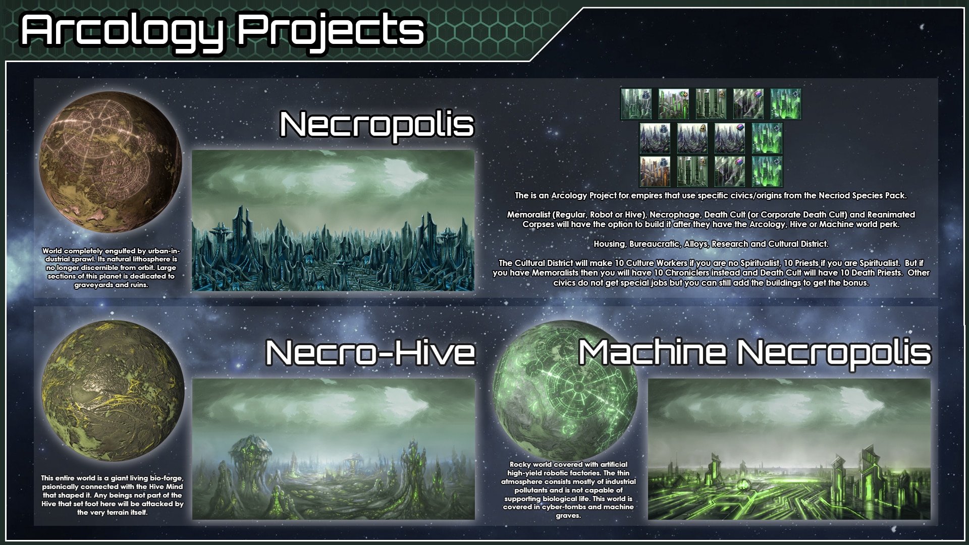 - Некрополь. Аркология на тему некроидов с исследованиями, сплавами и культурой смерти. Открыт для любой расы с происхождением Некрофагов или «некромантскими» гражданскими моделями.