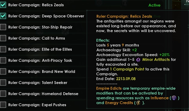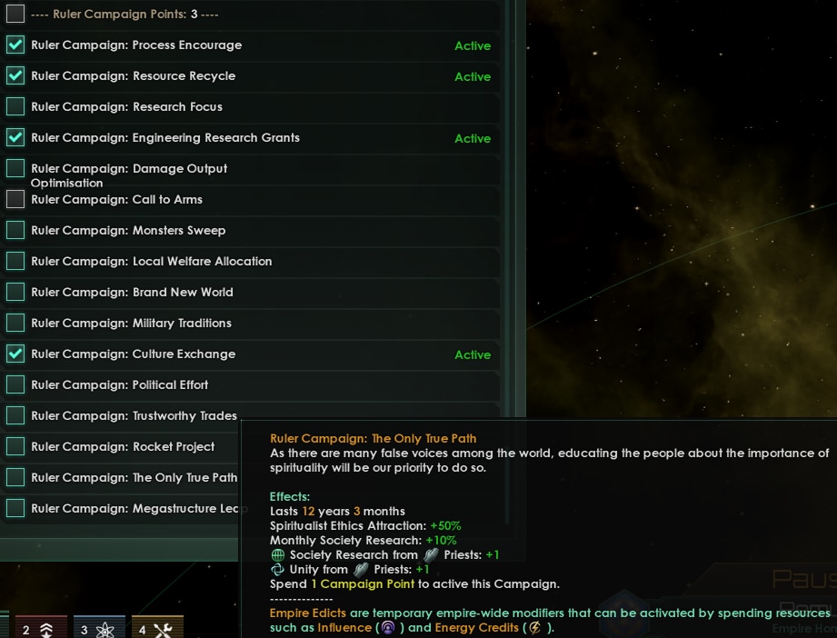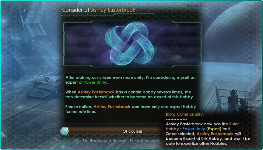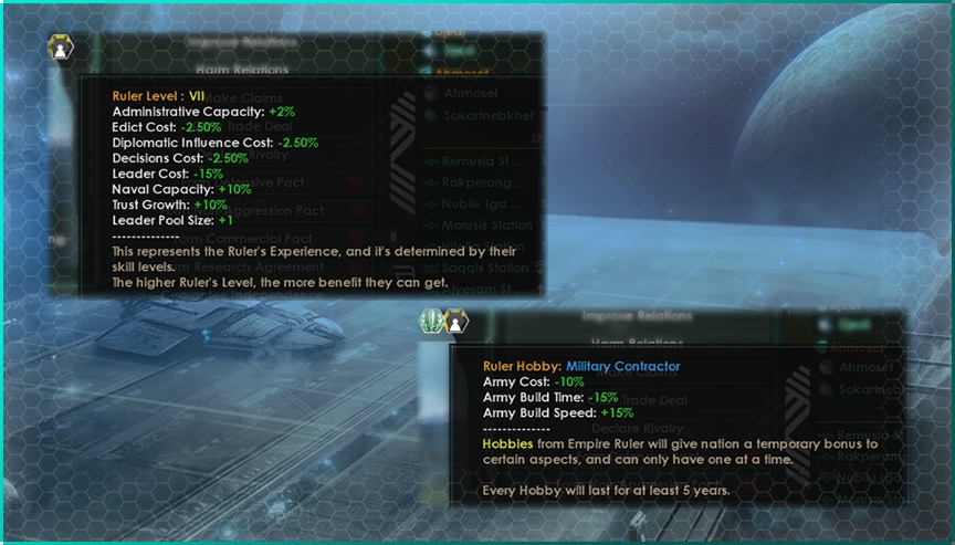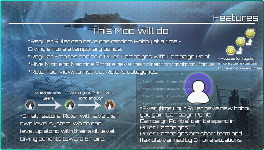 Ruler Level System добавляет ещё одну систему уровней для правителей. По ходу прокачки правители могут выбирать хобби, которые будут давать пассивные бонусы вашей империи.