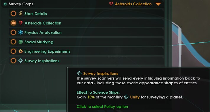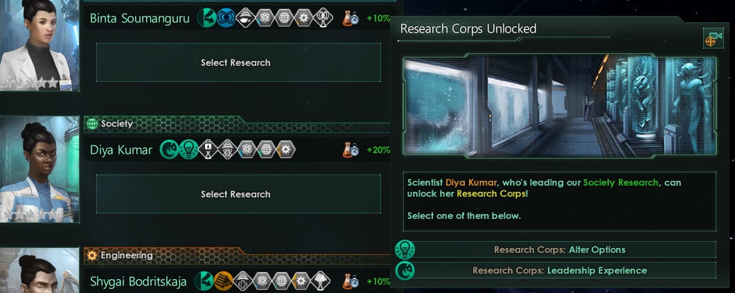 - Исследовательские корпуса. Специальная политика, которая дает вам очки исследования или ресурсы, когда ваши ученые успешно выполняют исследовательские миссии.