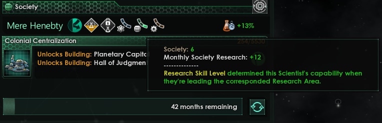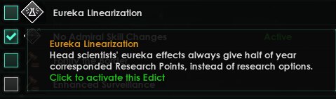 - Статус прозрения. При достижении 100% исследования технологии, учёные будут получать очки исследований за полугодие или новую технологию для исследования.