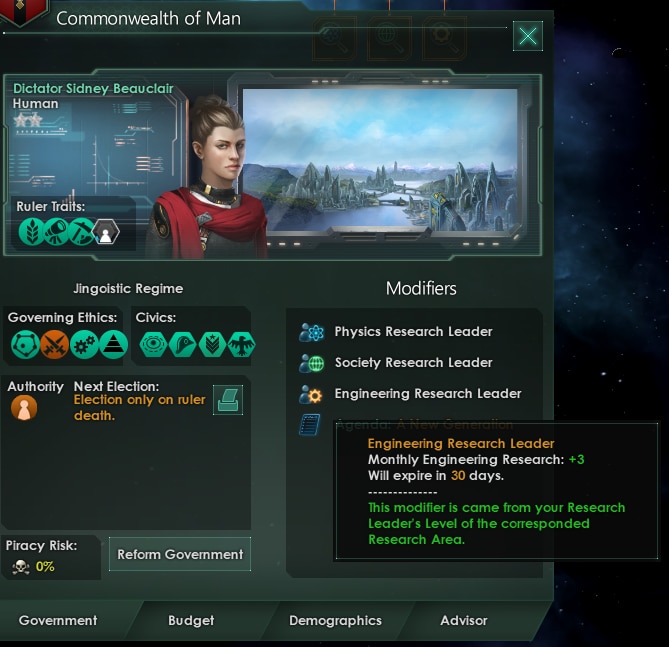- Уровни исследования. Шкала в 15 уровней, которая определяет, насколько ваш учёный хорош в той или иной области науки. Чем опытней учёный, скажем, в инженерии, тем быстрее будут исследоваться технологии в этой области.