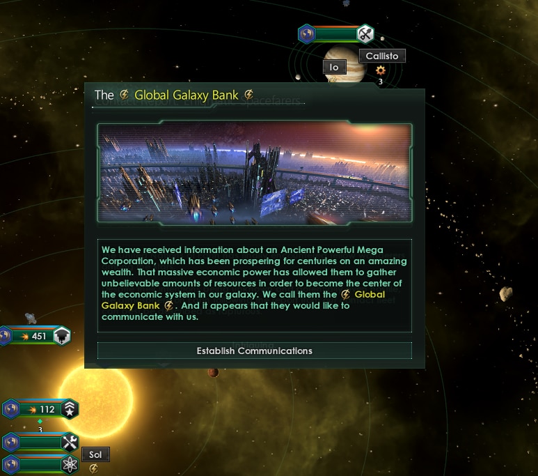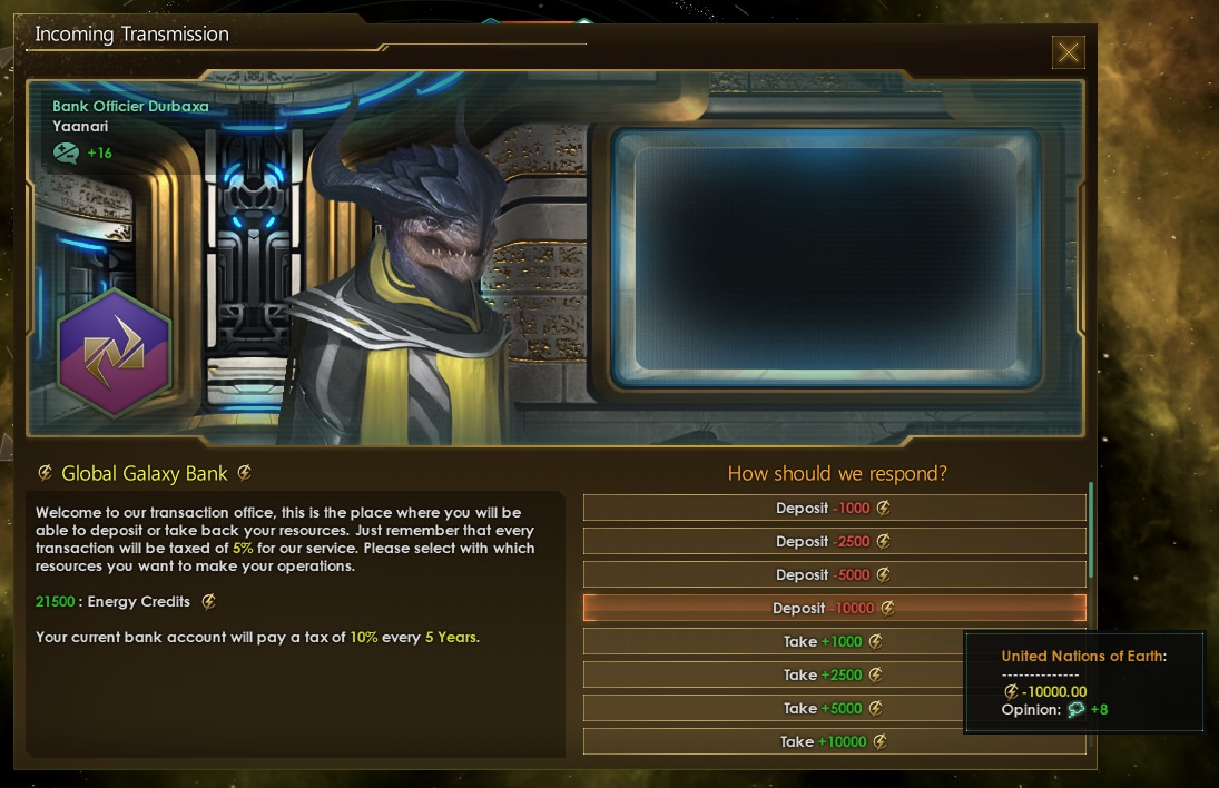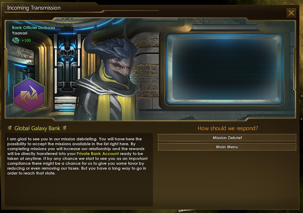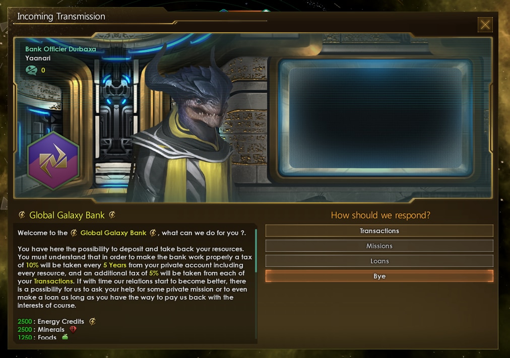 Galaxy Bank добавляет в игру галактический банк. Теперь вы сможете брать кредиты, хранить излишки ресурсов и забирать в нужным момент, выполнять миссии банка и покупать его акции, чтобы потом на них заработать.