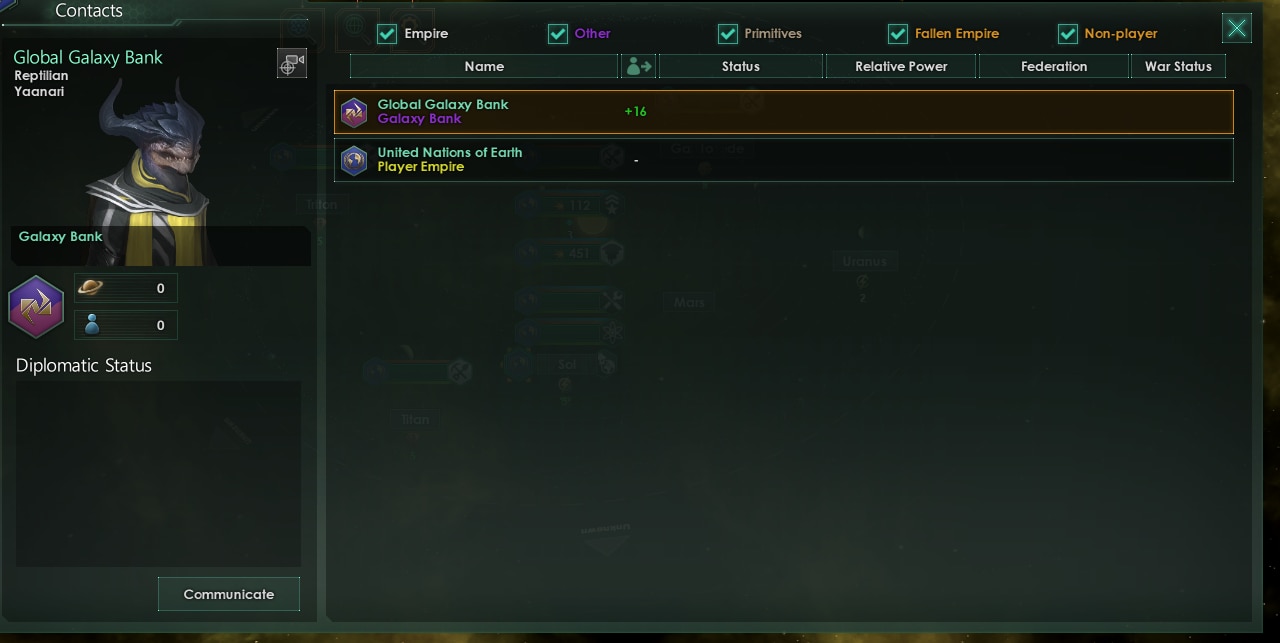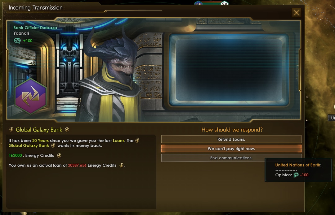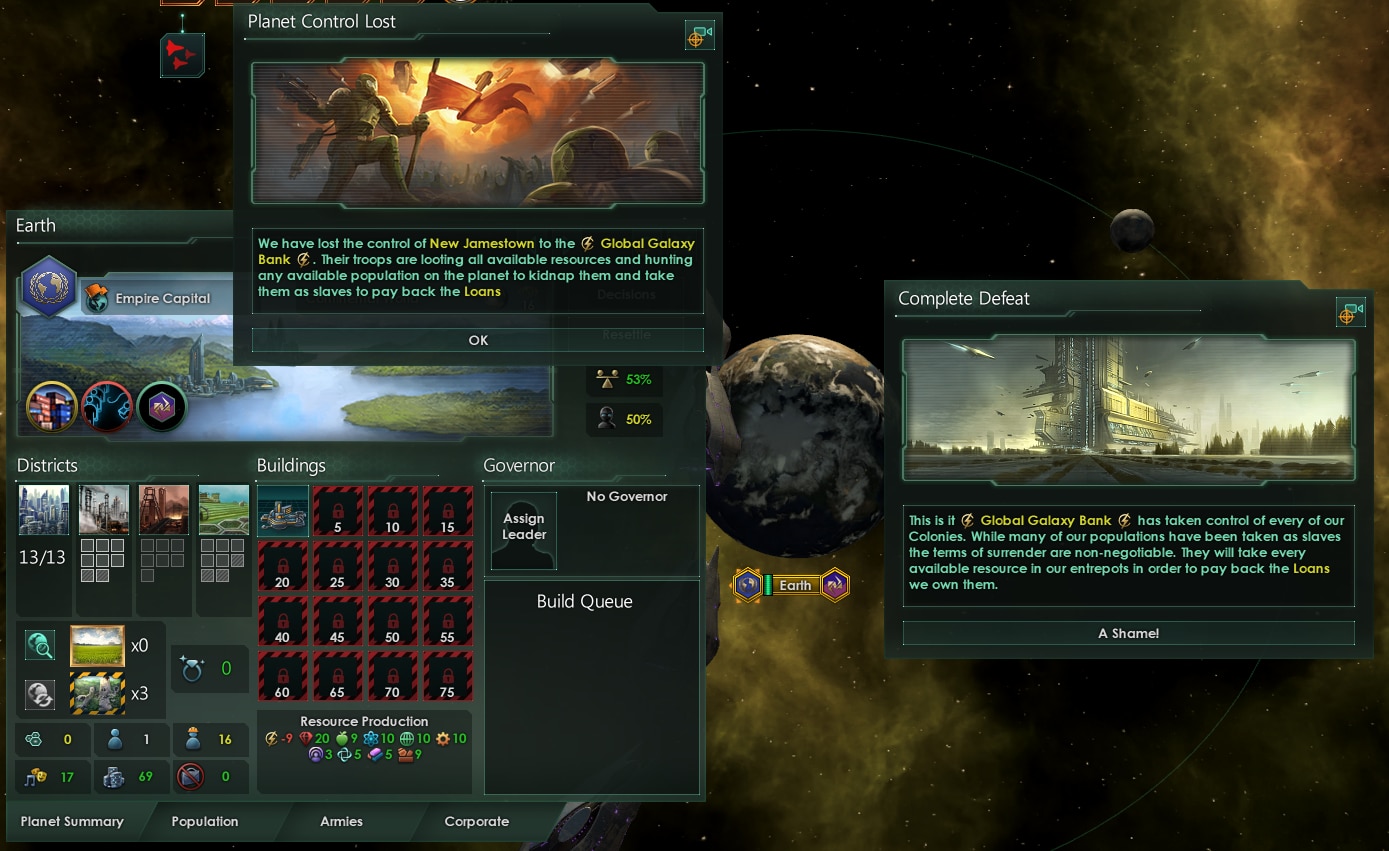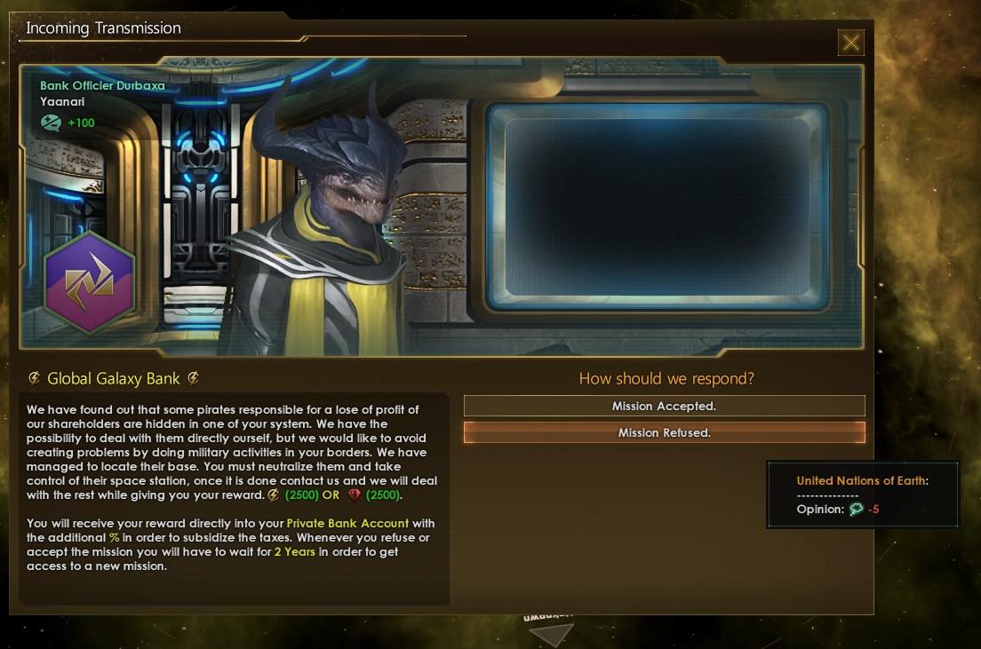 Galaxy Bank добавляет в игру галактический банк. Теперь вы сможете брать кредиты, хранить излишки ресурсов и забирать в нужным момент, выполнять миссии банка и покупать его акции, чтобы потом на них заработать.