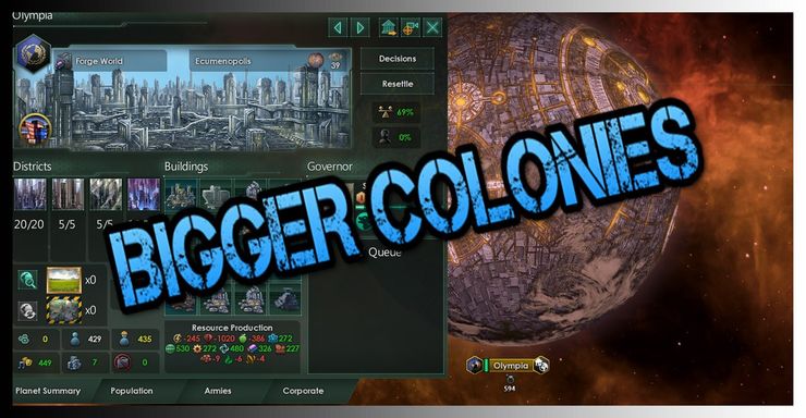 Bigger Colonies добавляет рост размера колоний по мере роста населения. Чем больше население и построенных районов, тем больше сама планета. Так будет происходить не со всеми планетами, а только с определенным процентом, чтобы сохранить некое подобие баланса. Количество процентов растущих планет можно будет выбрать в начале каждой игры.