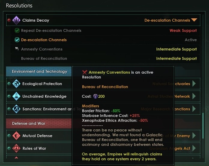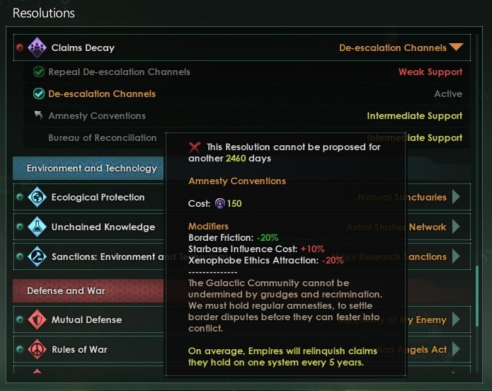Claims Decay - Dynamic Diplomacy добавляет новую ветку резолюций галактического сообщества, которые позволяют всем империям каждые 10/5/2 года отзывать претензии на другие империи.