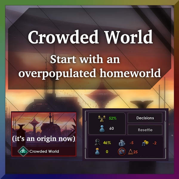 Мод добавляет новое происхождение, взяв которое вы начнёте игру в перенаселённом мире (60 жителей), с риском восстания и бонусами на переселение.