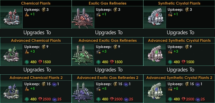 Мод добавляет улучшения заводов синтетических кристаллов, заводов по переработке экзотических газов и химических заводов. А также два новых здания, производящих темную материю и наниты.