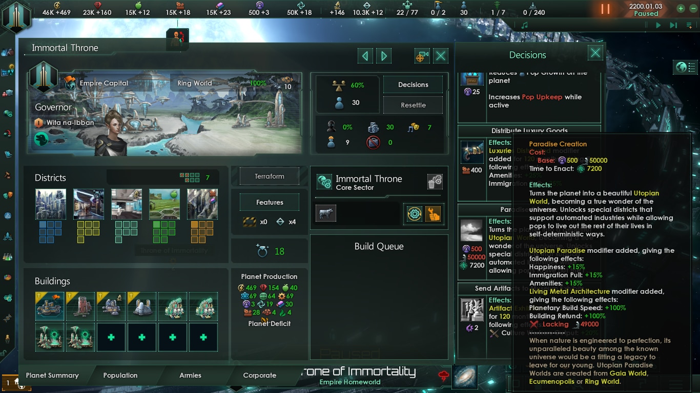 - Новая потерянная технология: Создание рая, которая разблокирует новое, дорогостоящее, планетарное решение.