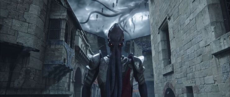 – В представленном во время анонса игры на конференции Google Stadia тизере, воин из ордена Пылающего Кулака (наёмной организации, выполняющей роль городской стражи во Вратах Балдура) подвергается процессу цереморфоза и превращается в иллитида. Иллитиды — высокоразвитая раса гуманоидов-псиоников, когда-то управлявшая огромной империей, простирающейся на множестве планов, но потерявшая своё могущество в результате восстания рабов и войн с другими расами. В новой игре им будет отведена роль главных злодеев (или одних из главных злодеев). В последних кадрах тизера в небе на несколько мгновений проступает силуэт огромного воздушного судна со щупальцами — наутилоида, корабля, способного перемещаться между планами, наследия той давно падшей империи, которую иллитиды собираются восстановить.