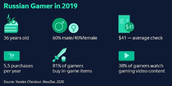 Средний возраст российского геймера – 36 лет. 61% мужчин и 39% женщин на ПК. По данным исследователя рынка NewZoo, 21% мужчин и 13% женщин играют в консольные игры. За последние шесть месяцев большинство (81%) платящих геймеров тратили деньги на игровые предметы или виртуальные товары, причем 36% мужчин и 42% женщин покупали разного рода бонусы. Игровой видеоконтент смотрят 38% онлайн-пользователей, а 65% из них смотрят его на своем ПК.