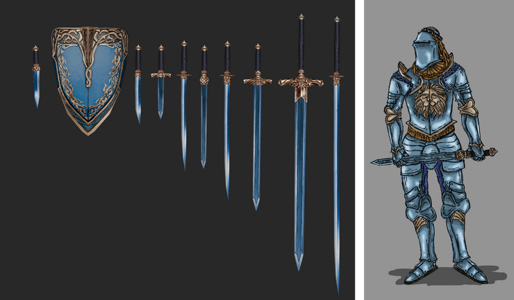 Уже реализованное мифриловое оружие и щит от Cicero (слева) и концепт полного комплекта мифриловых доспехов от Xeno (справа)