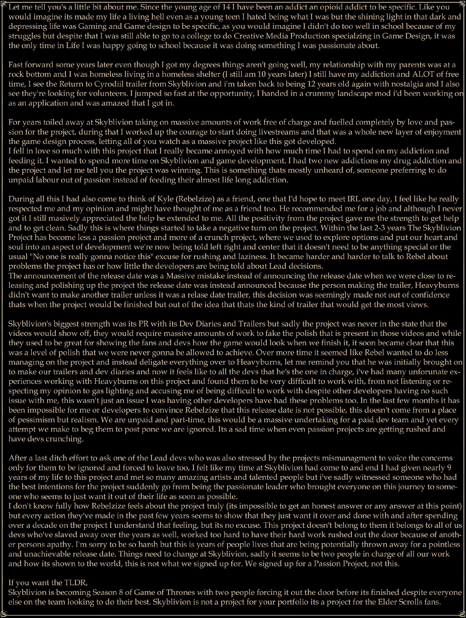 Несмотря на разочарование, он подчеркнул, что гордится проделанной работой и благодарен за опыт и возможности, которые дал проект. Но, по его мнению, чтобы Skyblivion действительно оправдал ожидания фанатов, внутри команды необходимы перемены.