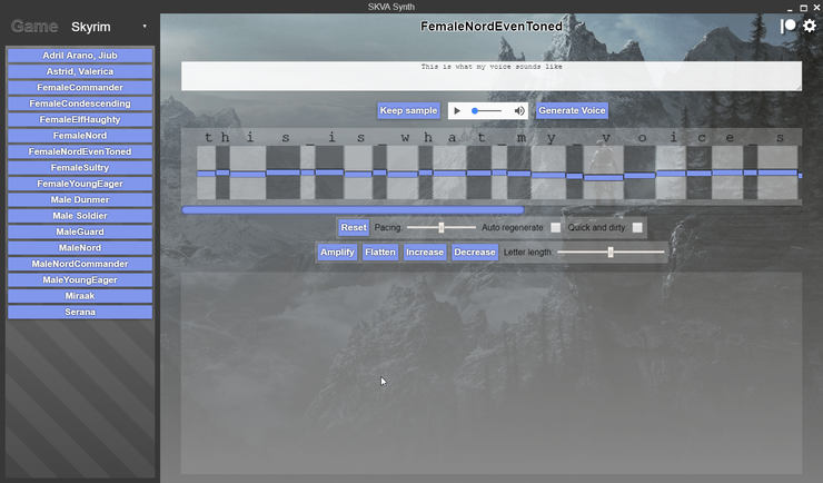 Приложение умеет загружать готовые модели (в частности для Skyrim сделаны модели на основе Астрид, Мираака, Сераны, мужских и женских нордов и данмеров, например). Также есть возможность изменять тональность и продолжительность букв для лучшего контроля эмоций и акцента.