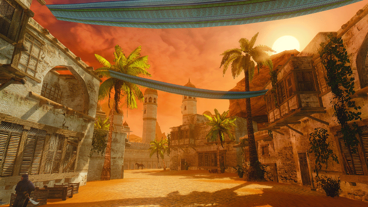 Несмотря на свою малолюдность, все локации проработаны очень тщательно, и достаточно одного взгляда, чтобы увидеть, сколько труда автор вложил в свою модификацию. Город, в котором начнутся ваши приключения, встречает не только реалистичной архитектурой, но и деталями, которые приятно удивят дотошного игрока. Это и прилавки со специями, аутентичные лавки и даже чайханы, расположившиеся по всему базару. Дрожащее марево, поднимающееся от раскаленных песков, под навесами восседают купцы на узорных коврах и подушках. В воздухе разлит дух волшебного востока. Исследовать эти города одно удовольствие. И да, мелкие детали, вроде множества рыбацких лодочек, подушек и питьевых фонтанчиков, добавляют еще больше колорита и очаровывают с первых минут.