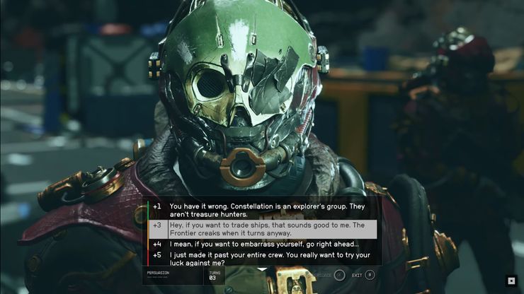 По мнению Тодда Говарда при разработке Starfield команда вернулась к классическому стилю диалогов Bethesda, когда вы смотрите на персонажа и следите за его реакцией. Используя специальные очки, игроки могут попробовать убедить NPC в чем-то, например, отдать корабль.