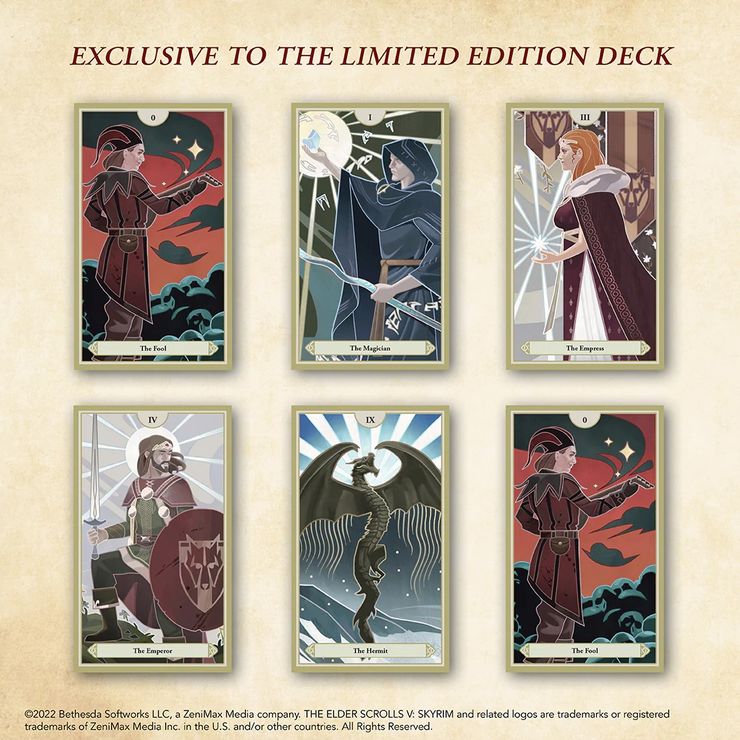 Insighteditions представила два набора обычный и лимитированный. Оба набора The Elder Scrolls V: Skyrim Tarot Deck содержат в себе: