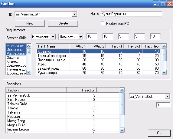 Создать новую организацию в Морровинде просто. Зайдите в Character -> Faction, нажмите кнопку New и введите новый ID, а затем название своей организации в поле Name. То, что вы напишете в Name, будет видно игроку в диалогах и т.д., а ID видно только разработчику в КС. Однако не совсем ясно, зачем понадобилось создавать 2 поля - ID и Name, ведь информация, что в них написана, в оригинальном Морровинде просто дублируется. Однако, если вы проводите какие-то операции с этой организацией в скриптах и т.д., указывайте именно ID, а не имя. Например, ModPCFacRep, 5, "Imperial Legion" (повышает репутацию у игрока на 5 среди членов Имперского легиона).