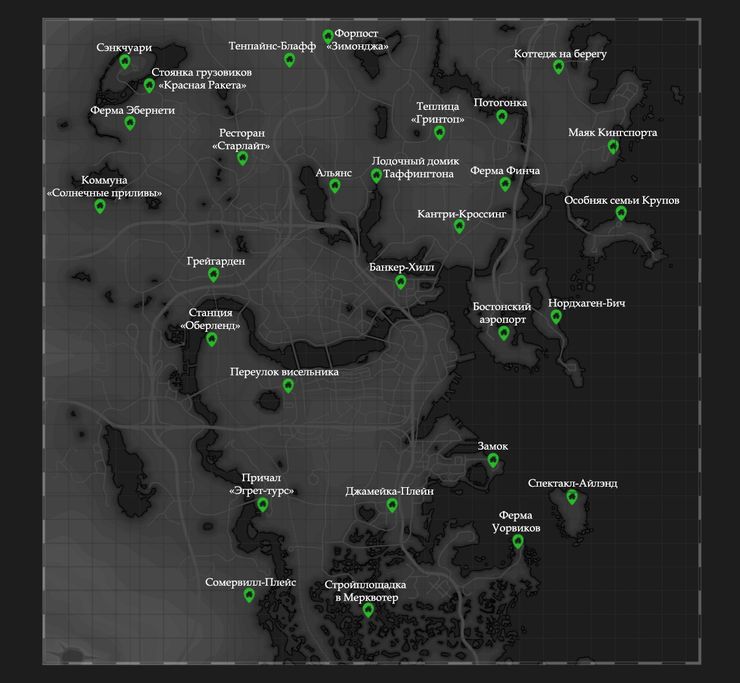 На территории Содружества находится всего 29 поселений доступных к застройке и заселению. Большинство из них требует выполнения определенных заданий местных жителей, либо освобождения от рейдеров. Чтобы найти поселение, просто воспользуйтесь картой представленной ниже:
