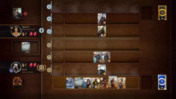 Имейте ввиду, что во время игры у Вас не будет возможности поменять карты (исключением являются способности некоторых карт). В игру играют по очереди — бросок монеты решает, кто ходит первым. Каждый ход можно положить на стол только одну карту или же спасовать. Если вы спасовали, то противник продолжит выкладывать карты, пока тоже не спасует. Когда оба игрока спасовали, начнётся подсчёт боевой силы выложенных карт. Не стоит выкладывать сразу все карты в первом раунде, ведь они могут пригодиться в следующих.