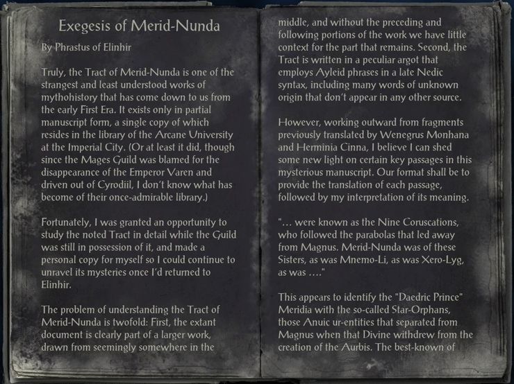 Трактат о Мерид-Нунде, дошедший до нас из начала Первой эры, поистине одна из самых странных и малопонятных работ по мифоистории. От него сохранилась только небольшая часть в виде манускрипта, единственный экземпляр которого хранится в библиотеке Университета волшебства в Имперском городе. (Или по крайней мере хранился, потому что Гильдию магов обвинили в исчезновении императора Варена и изгнали из Сиродила, и я не знаю, что стало с их когда-то замечательной библиотекой.)