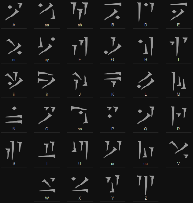 | В драконьем языке 34 буквы без разделения на строчные и заглавные. Для aa, ah, ei, ey, ii, ir, oo, uu, and ur предусмотрены отдельные символы. Буквы с апострофом (') могут произносится либо как один звук или как два. |