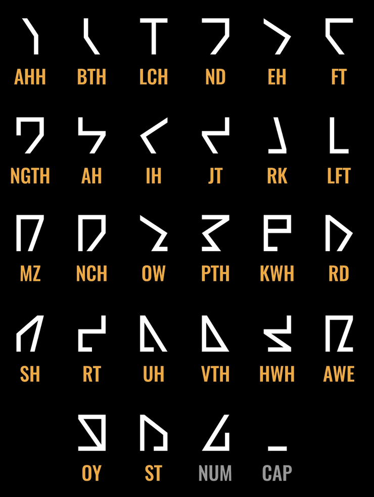 А именно все звуки различающие слова в языке. Во избежание разночтений все написано латиницей, ссылки на википедию для ознакомления с произношением. Обратите внимание, что в русском переводе [ng] и [th] утрачены, вместо них — [н] и [т] соотв-но. e.g. Arkng-thand — Аркнтанд, Irkngthand — Иркнтанд... Также неизвестно назначение h в сочетаниях с гласными, она либо означает долготу, либо означала ранее, а теперь просто служит для различия на письме.