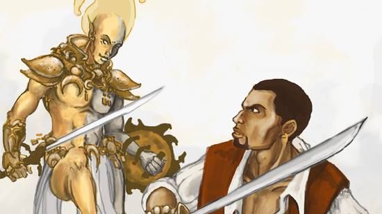 "Упорство," — сказал Вивек, стремительно вытаскивая свой меч — "Его я тоже обожаю. Я — обман избытка Чёрных Рук, и сейчас я им управляю, а это право было приобретено не без упорства. Могу ли я назвать тебя своей женой, когда всё это закончится?"