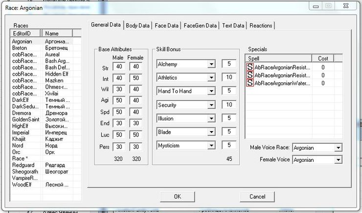 Загрузилось? Хорошо, идём дальше. В меню Character выбери пункт Race..., откроется окно (рис. 4). В этом окне ты видишь список всех рас, которые есть в загруженных плагина. Расы из плагина, который мы выбрали активным, отмечены звёздочкой в конце.