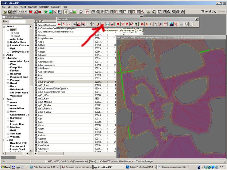 Отключаем G-режим, выбираем ненужный 3к и удаляем. Здесь и далее старайтесь избегать возникновения при этом маленьких, а также узких и длинных треугольников. При проверке на ошибки редактор их пропускает обычно, но движок игры к сожалению к этому привередлив, и вы получите дефект зоны, другими словами начинай все сначала. (Верный признак этого - вылет игры, при входе в ячейку или нпс просто стоят.) О зеленых мешах: это границы ячейки, их можно удалять, если вы где то такую удалили или зацепили, ничего страшного тут нет, но придется финализировать ячейку, об этом позже.