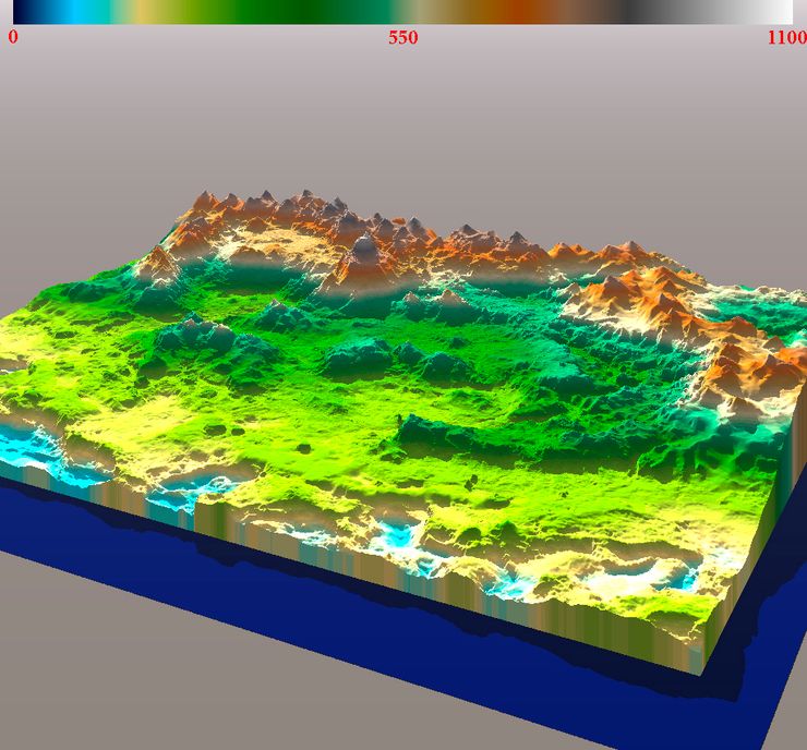 Использование же таких глубин и высот на практике маловероятно. К примеру мир Tamriel содержит 3808 x 3008 HP, а разница по высоте между самой высокой и самой низкой точками ландшафта составляет 1063 метра. В 3D это выглядит так