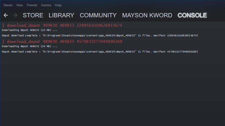 Откройте окно "Выполнить" и введите команду "steam://open/console" без кавычек. Откроется консоль Steam, где вы сможете выполнить команду download_depot. Синтаксис прост: "download_depot App-ID Depot-ID Manifest-ID" без кавычек. Таким образом, чтобы скачать файл SkyrimSE.exe версии 1.5.97, вам нужно выполнить в консоли Steam команду "download_depot 489830 489833 2289561010626853674". После успешной загрузки файла консоль уведомит вас, по какому пути он теперь лежит.