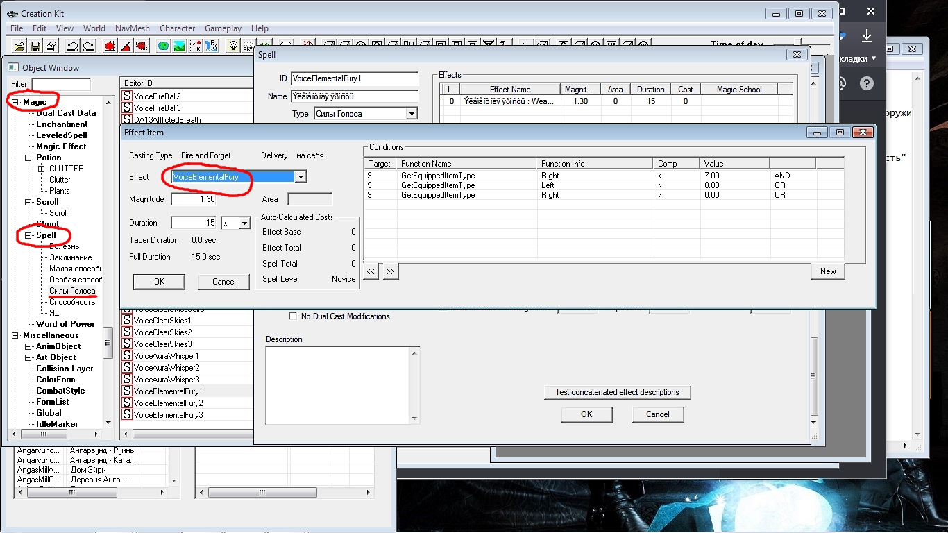 Для этого во вкладке Object Window - > Magic - > Spell - > Cилы Голоса находим эти слова (VoiceElementalFury1, VoiceElementalFury2 и VoiceElementalFury3) и указываем наш новый Magic Effect (рис. 5)