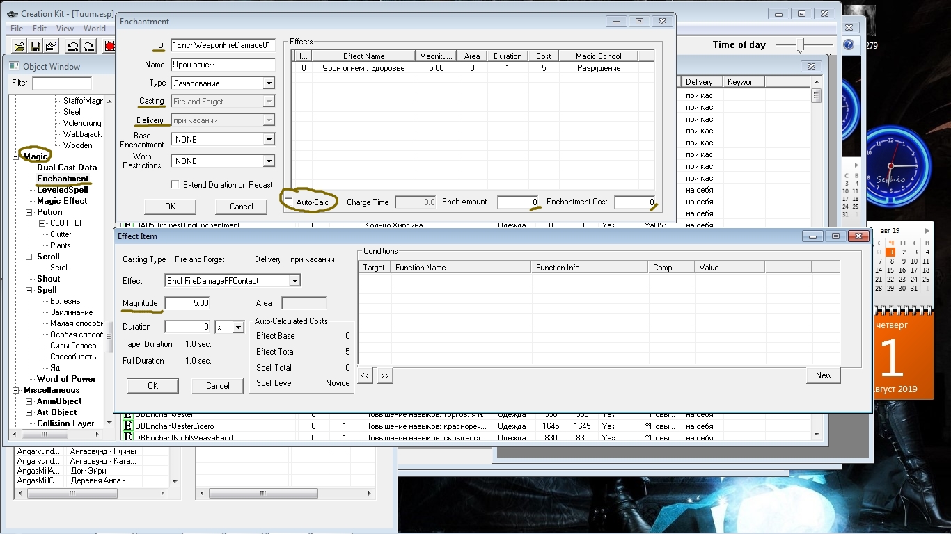 Затем идём во вкладку Object Window - > Magic - > Enchanment и создаём новое оружейное зачарование как на рис. 3