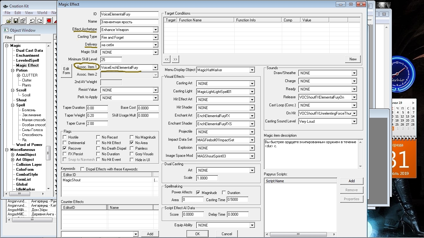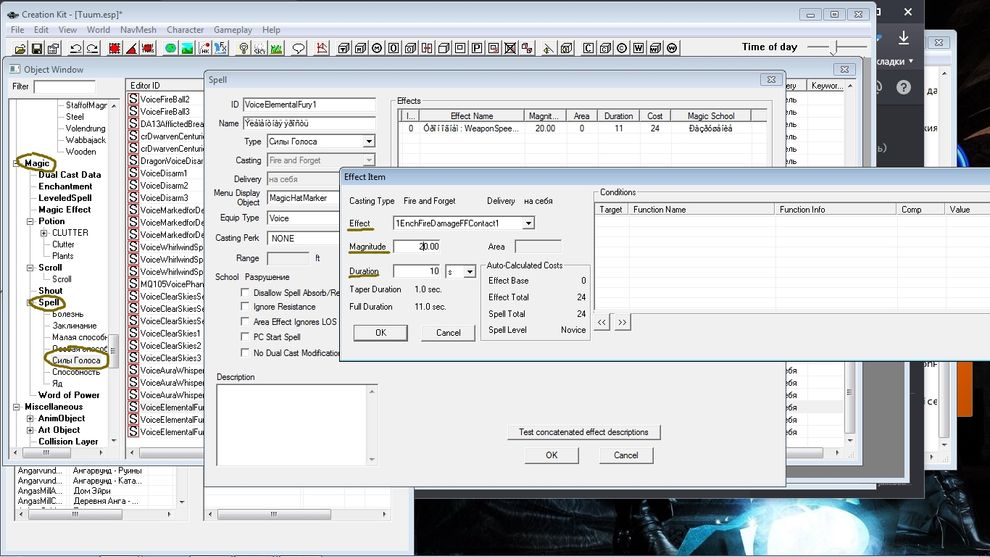 Итак! Для начала перейдем во вкладку Object Window - > Magic - > Spell - > Cилы Голоса и откроем любое слово Крика "Элементная ярость" (рис. 1)